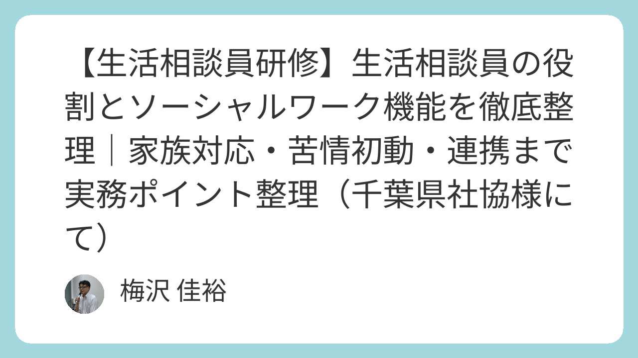 一日を通して、生活相談員としての専門性を“再現可能な形”に落とし込み、明日からの実務に持ち帰れる研修となりました。ご参加の皆さま、そしてご準備くださった千葉県社協の皆さまに、心より御礼申し上げます。