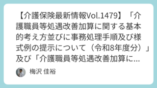 福祉制度・介護保険の最新情報ニュース 【介護保険最新情報Vol.1479】「介護職員等処遇改善加算に関する基本的考え方並びに事務処理手順及び様式例の提示について(令和8年度分)」及び「介護職員等処遇改善加算に関するQ&A(第1版)」の解説 介護保険最新情報Vol.1479をもとに、介護職員等処遇改善加算の令和8年度運用を実務者向けに解説。Q&A第1版と⑧令和8年度特例要件の重要点、届出・算定・実績報告のポイントを整理しました。 2026.03.22 福祉制度・介護保険の最新情報ニュース