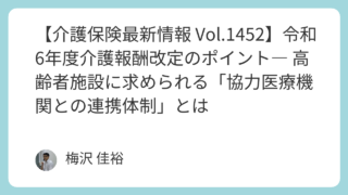 13.介護保険最新情報・ニュースまとめ 【介護保険最新情報 Vol.1452】令和6年度介護報酬改定のポイント― 高齢者施設に求められる「協力医療機関との連携体制」とは 令和6年度介護報酬改定で見直された「協力医療機関との連携体制」について、介護保険最新情報Vol.1452をもとに、義務化と努力義務の違い、制度趣旨を高齢者施設向けに分かりやすく解説します。 2025.12.26 13.介護保険最新情報・ニュースまとめ