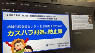 14.登壇した介護研修・セミナー紹介 【新宿区社会福祉士連絡会】地域包括支援センター職員のためのカスハラ対処と防止策研修を実施しました 新宿区社会福祉士連絡会で「カスハラ対処と防止策研修」を実施。地域包括支援センター職員のために、実践的な初動対応と感情ケアを学ぶ内容です。 2025.11.24 14.登壇した介護研修・セミナー紹介
